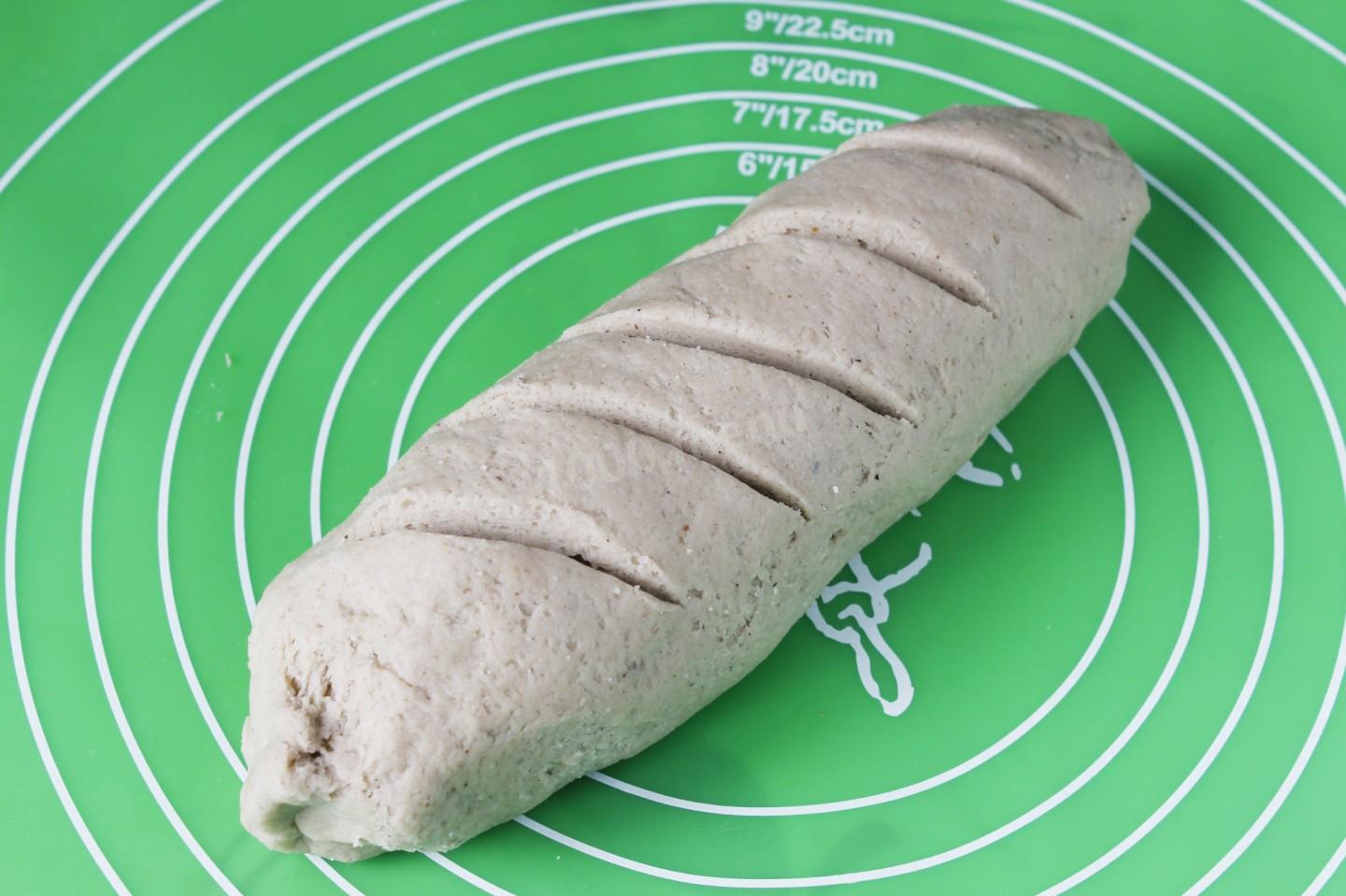 Звертаємо тісто від короткого краю рулетом. Защипуємо краю і робимо ножем поперечні надрізи під невеликим нахилом на відстані 2-3 см один від одного.