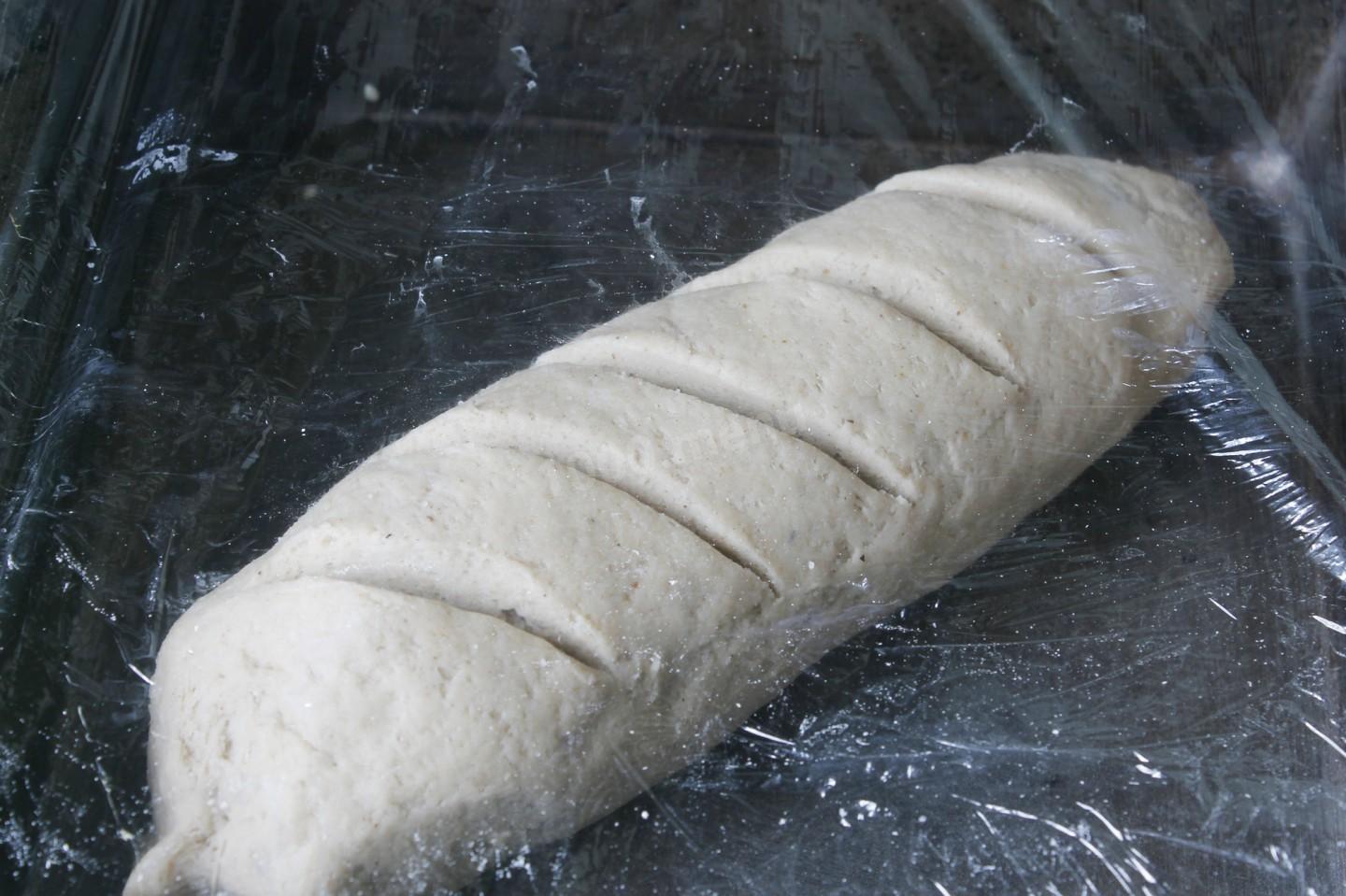 Переміщаємо заготовку в форму для запікання, накриваємо харчовою плівкою і залишаємо підійти ще на 30 хвилин.