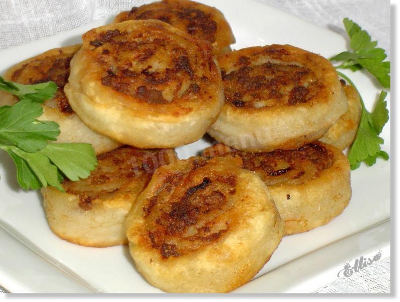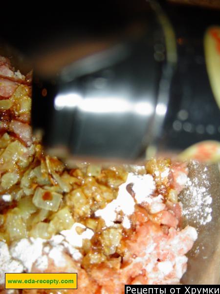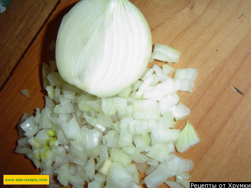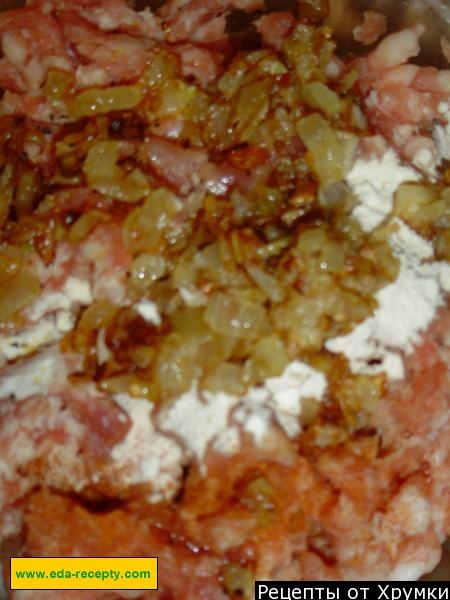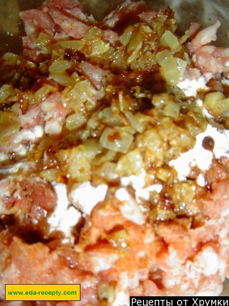 Начинка: нарізану кубиками цибулю обсмажуємо в раст.маслі, змішуємо з фаршем. Кладемо сюди ж часник-пудру, соєвий соус ложку, спеції.