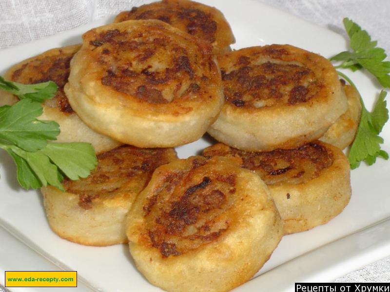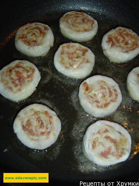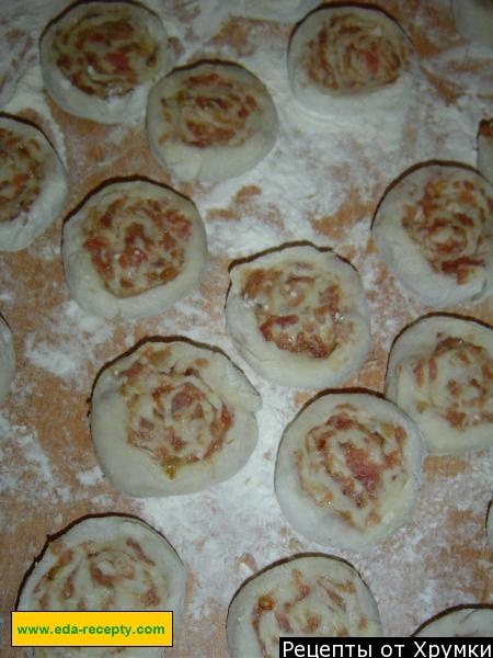 звертаємо тісто в рулет, краї защипуємо, нарізаємо на шматки по 2 см в товщину.