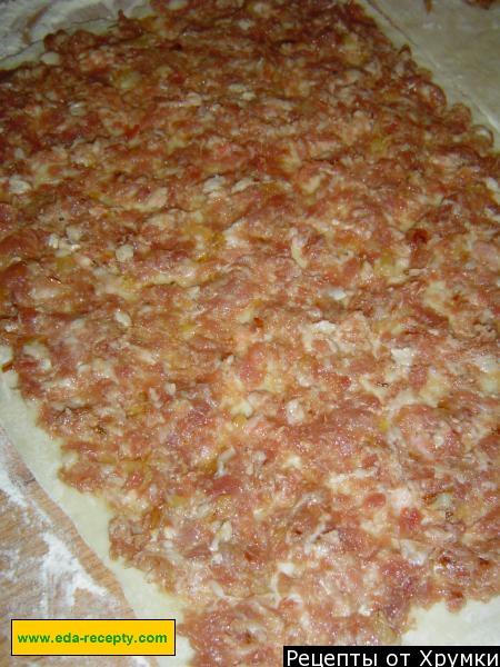 присипаємо борошном стіл, тісто розгортаємо в тонкий пласт. На пласт кладемо шар фаршу рівномірно.