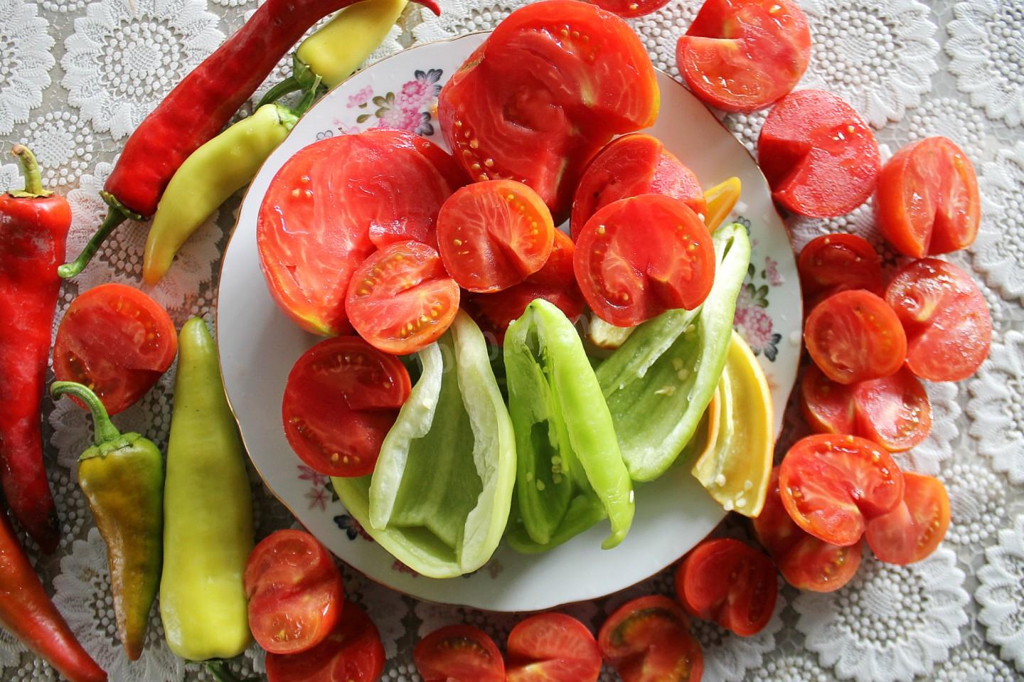 Томати розріжте на дві або чотири частини, так їх буде зручніше переробляти в подальшому. Видаліть місця, де кріпилася плодоніжка за допомогою ножа. Перці розріжте навпіл, приберіть все насіння і білі прожилки всередині овоча.