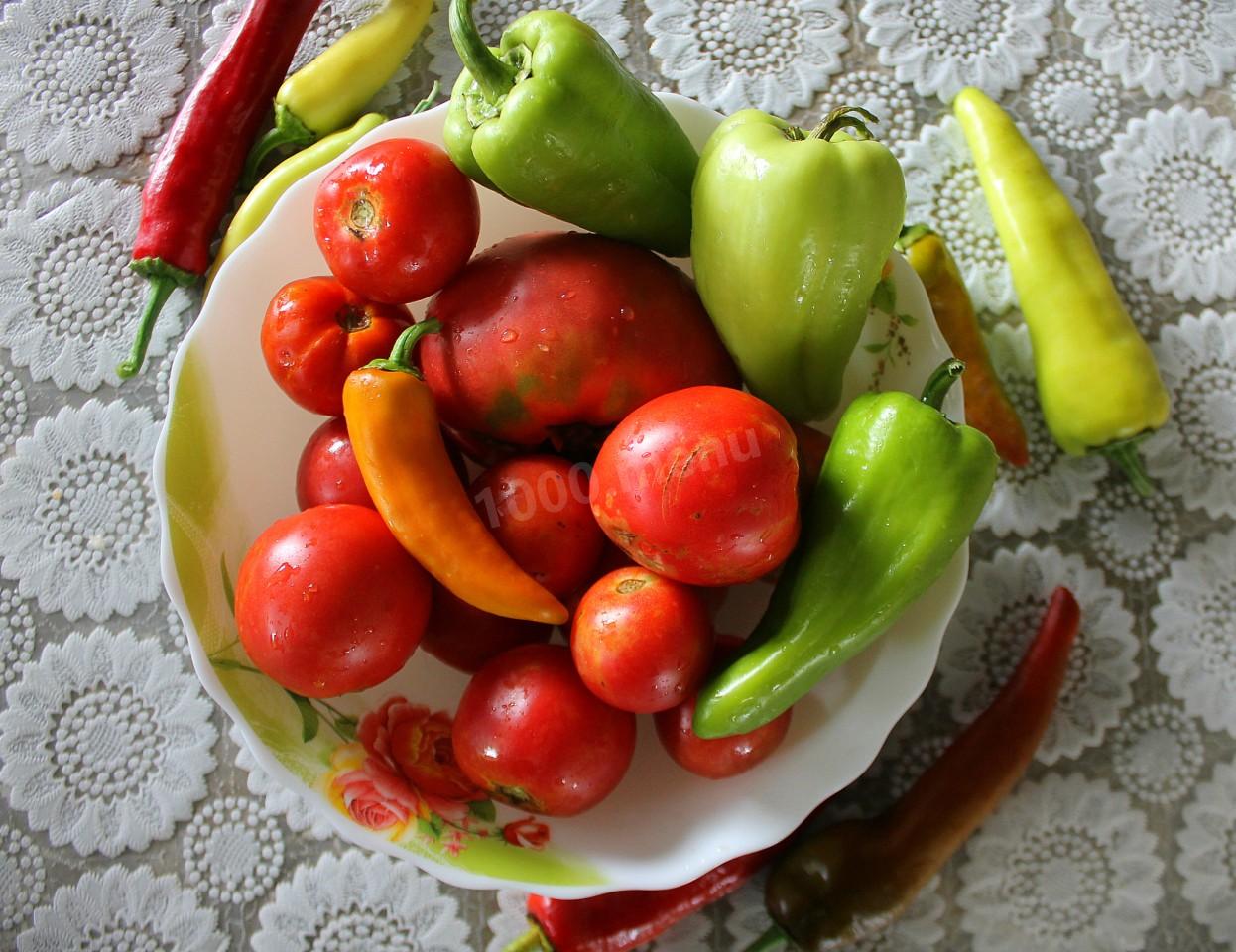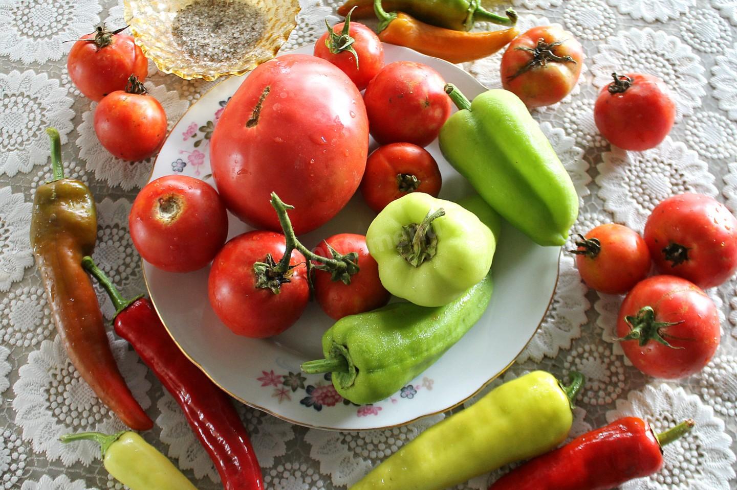 З помідорів видаліть плодоніжки, вимийте всі овочі під проточною чистою водою. Обсушити їх за допомогою паперових серветок або рушники. За бажанням поряд з болгарським перцем, можна використовувати перчик чилі, тоді готову страву вийде гоструватим і пікантним на смак. Я взяла в цей раз для рецепта 3 стручка гострого перцю.