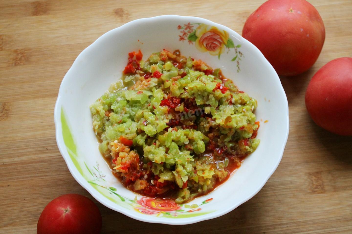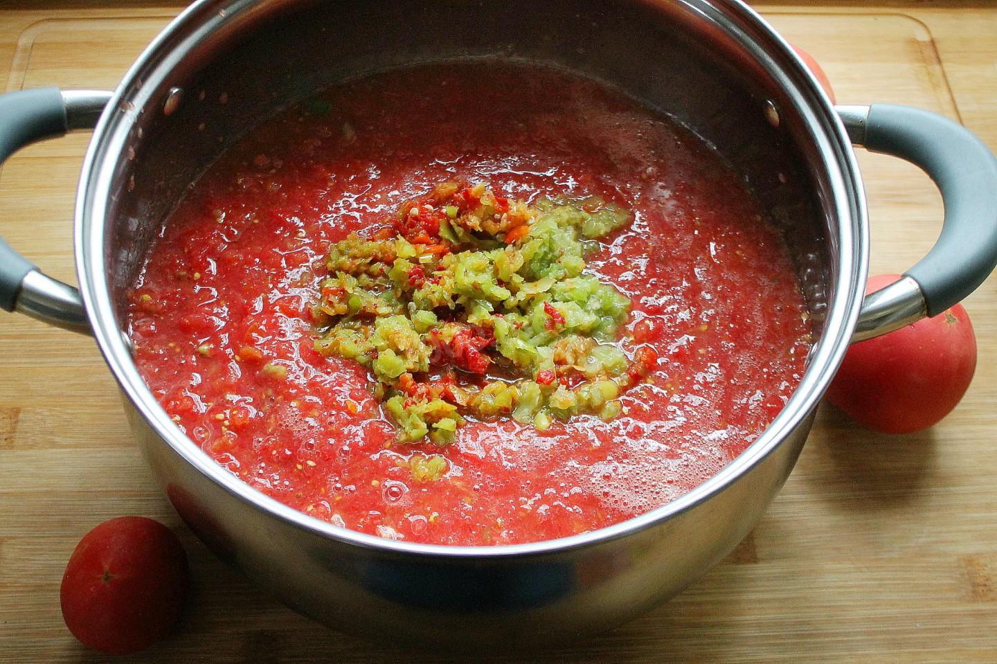 У велику каструлю або чашку відправте перекручені овочі і додайте сіль. Ретельно все перемішайте, спробуйте соус на смак. Якщо вам не вистачає солі, то трохи досоліть. Поставте помідорову заправку на плиту і після закипання варіть на повільному вогні близько 15 хвилин (не забувайте іноді перемішувати).