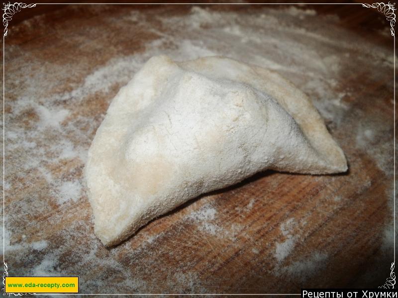 4. Кожен сканец присипати борошном з обох сторін і загорнути в нього, в самий центр, трохи курячої маси. Зігнути сканец з м'ясом навпіл і защипнути краю. Далі з'єднати два куточка разом.