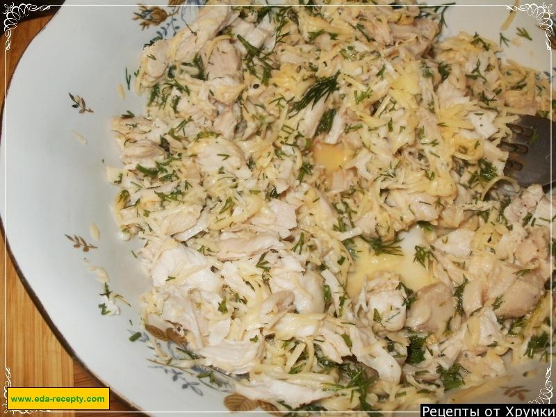2. Куряче філе відварити, остудити, розділити на волокна, змішати в єдину масу з 1 яйцем, молоком, тертим сиром, сіллю, перцем, дрібно рубаним кропом і меленим часником.